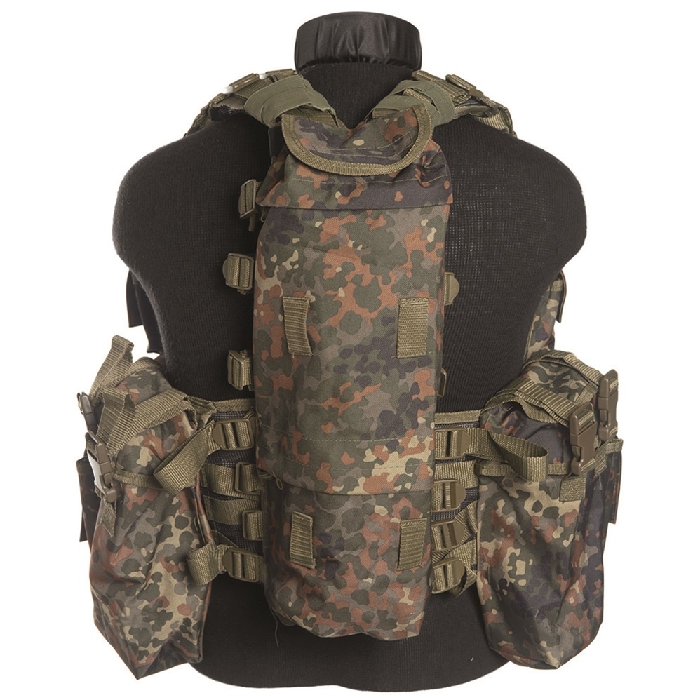 Жилет тактический, камуфляж Flecktarn, 12 карманов EINSATZWESTE TACTICAL (12 TA.) FLECKTARN Art.-Nr. 10711021 Внешний материал: 600D полиэстер с поливинилхлоридным покрытием Подкладка: 210D полиэстер с покрытием из полиуретана.